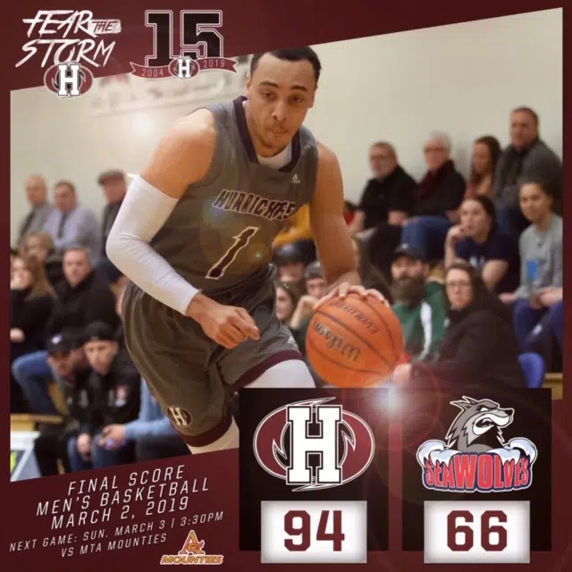 Holland College as Coach Josh Whitty’s Hurricanes improved 22-0 as they ran over UNB Saint John, 94-66 in the ACAA semi-finals in Moncton. The Hurricanes are going for a 7th straight conference title and were led by Roosevelt Whyley with 25 points and nine rebounds. Martin Campbell had 22 points, 7 rebounds and 5 assists.