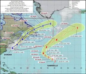 Dorian will still be a Category 2 hurricane when it crosses over the Maritimes Saturday. The eye will be over Halifax. It may also be a Category 1 as it passes over eastern PEI. A Category 1 has sustained winds of 119 KM/H.